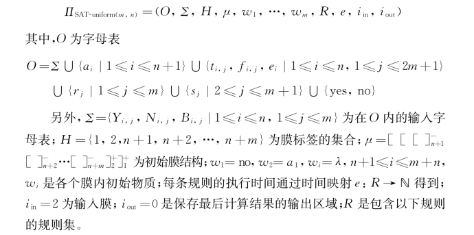 总的来说,对于每个包含对象t i,1(resp.,f i,1)的膜,在变量每次循环计算过程中这些膜内应用的规则是相同的,因此每个膜标签为2的膜中对象t i,2m+1(resp.,f i,2m+1)是同时生成的。注意到规则R 4,i,j以非确定性的方式应用,该规则中对应某条规则中的膜标签从n+1到n+m也因此是非确定选择的,但这对后面的计算结果不会有任何影响。