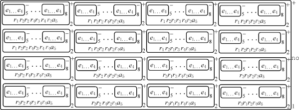 设e是规则的执行时间。对于给定的含有n个变量和m个子句的布尔公式,设变量为x i,1≤i≤n。一般地,膜2中的对象a i对应于变量x i。系统在初始状态下,膜1中含有对象no;膜2中含有对象a 1和输入多重集cod(γ)。