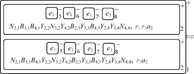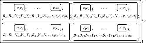 系统初始格局如图2-3所示。第一步,膜2在对象a 1的作用下分裂为两个与原始膜标签相同的新膜,同时,对象a 1进化为t 1,1和f 1,1后分别出现在新生成的膜中。在第一步,除了应用规则R 1,1之外,规则R 19也开始执行。在促进剂t 1,1(resp.,f 1,1)的作用下,应用规则R 2,1,j和R 3,1,j(1≤i≤m),对象Y 1,j(resp.,N 1,j)进化为对象r j和e 1;其他情况下只能生成对象e 1。当对象e 1出现在膜2中时,规则R 4,1,j开始执行,并且对象e 1进入具有膜标签4+j的任意一个膜,同时将其膜上电荷从负变为正。不能确定规则R 19的执行是否已经完成,因为这些规则的执行时间长短在时间无关模式下是不确定的。为了方便描述,在后面的图中假设规则R 19已经执行结束。