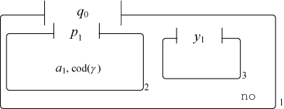 接下来,将给出系统详细的计算过程。通过计算过程可以看出该系统是如何工作的。设e是规则的执行时间。对于给定的含有n个变量和m个子句的布尔公式,设变量为xi,1≤i≤n。系统在初始状态下,膜1中含有对象no;膜2中含有对象a1,该对象对应于变量x1。另外,膜1上含有蛋白质q0;膜2上含有蛋白质p1;膜3上含有蛋白质y1。系统的初始格局如图3-1。