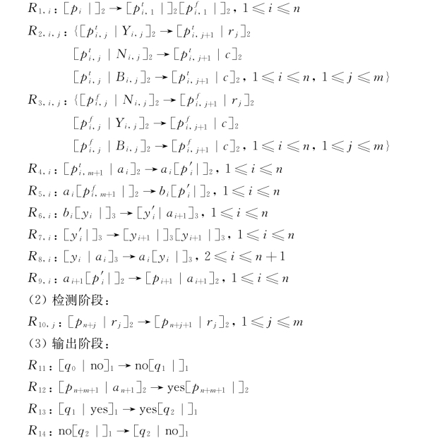 另外,Σ={Yi,j,Ni,j,Bi,j|1≤i≤n,1≤j≤m}为在O内的输入字母表;μ=[[]2[]3]1为初始膜结构;w1=no,w2=a1,w3=λ是各个膜内的初始物质;z1=q0,z2=p1,z3=y1是各个膜上初始状态下的蛋白质对象;iin=2为输入膜,iout=0是保存最后计算结果的输出区域;R1,…,R3表示区域1、2、3中规则的有限集,包含以下三个阶段的规则。