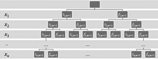 图4-1展示了n个变量的循环计算过程,上述规则产生的对象可以用二叉树中的结点表示。公式中每个变量在每次循环中相应的细胞都会分裂为两个细胞,这两个细胞中分别产生对象t i,m+1和f i,m+1对应二叉树的结点。因此每个结点对应变量的赋值true或false(左子树对应true,右子树对应false)。对于变量x i的每次循环计算过程,当规则R t(resp.,R f)中对应的规则全部执行结束时,在每个细胞2中会生成对象t i,m+1(resp.,f 1,m+1)。由于系统在时间无关模式下工作,对象t i,m+1和f 1,m+1并不是同时生成的。另外需要注意的是,对于每一次循环中每个包含对象t i,m+1(resp.,f i,m+1)的细胞,由于其中应用的规则是相同的,因此对象t i,m+1(resp.,f i,m+1)在每个细胞2中是同时生成的。这样,这些规则就能并行地同时执行。例如,对于图中变量x 3的循环计算过程,四个对象t 3,m+1(resp.,f 1,m+1)会在细胞2中同时产生。