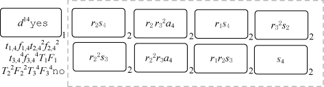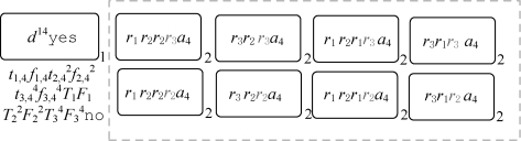 接着,规则R 12,1、R 13,1和R 14,1执行结束后,可以得到系统此时的格局(参见图4-4)。当变量x i(1≤i≤n)的第一次循环计算过程执行结束,标签为2的细胞中有对象a 2。在对象a 2的影响下,规则R 1,2将被应用,生成标签为2的四个细胞。当变量的第二次循环计算过程中所有规则应用完成时,即当规则R 14,3的执行结束,可以得到系统此时的格局(参见图4-5)。类似地,变量的第三次循环计算过程中所有规则应用完成时,可以得到系统此时的格局(参见图4-6)。