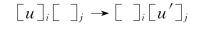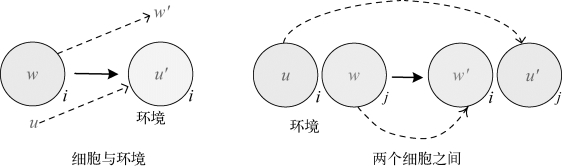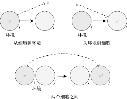 其中,i,j∈{0,1,…,m},i≠j,u∈O+,u′∈O*,|uv|>0,i和j分别对应区域i和区域j。如果i=0或者j=0,则对应的是环境;否则它们对应的是细胞。这类规则执行过程中,当多重集u出现在区域i中(该区域可能是一个细胞或环境),这个多重集会在转移到目标区域j的过程中进化为u′。对于这类规则,规则的长度为|u|+|u′|。该类规则的执行过程如图5-3所示。