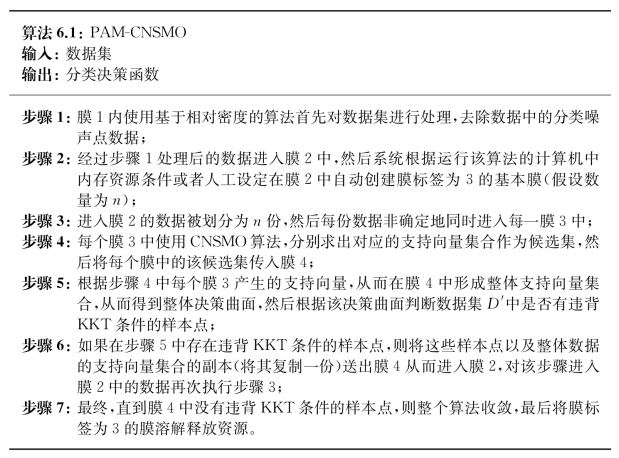算法框架如图6-4:通过在膜内进行反复迭代循环执行该过程,并且对整体数据验证KKT条件,使得该算法相比同类算法能够保留更多的支持向量,可以获得更好的泛化预测能力。最终,得到理想的分类决策函数,算法停止。