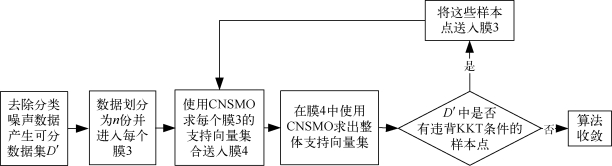膜2中的数据集D′被划分为4份数据(与膜3的膜数量一致),每份数据分别“非确定”地进入其中一个膜3后,再将CNSMO算法作为该膜内的候选算法,其主要操作是提取支持向量。将每个膜3中产生的支持向量集送入膜4得到整体数据的支持向量集合。通过得到的该整体支持向量集合,就能获得分类决策函数,从而可以判断膜4中的数据集D′中是否有违反KKT条件的样本。如果存在违背KKT条件的样本点,则将这些样本点以及整体支持向量集合的副本送出膜4,然后将该数据集(即整体数据的支持向量集合以及违背KKT条件的样本点)进行数据划分,分为4份后再分别进入每个膜3,并将该数据用于下次迭代计算过程,即再次执行膜3中的CNSMO子算法对最新送入膜内的数据集进行训练。该迭代过程会反复执行,直到膜4中没有违背KKT条件的样本点。最终系统计算结束,并将此时的分类决策函数作为系统最终计算结果。