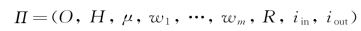 其中,O为对象字母表,表示各个膜中物质的有限集合;H={1,2,3,4}为膜标签的集合;m=[[[]4]2]1为初始膜结构;w i(1≤i≤4)是各个膜内初始物质;w 1内为输入数据集合,w 2=w 4=λ;i in=1是数据的输入区域;i out=4是保存最后计算结果的输出区域;R是规则集,包括物质进化规则、通信规则、膜溶解规则以及膜创建规则等。这些规则对应于系统中子算法中的各种操作算子。膜中物质的多重集可表示多维数据集和决策函数,而物质的进化规则就是对膜内物质进行修改,相当于各个子算法中具体操作后相应数据的变化。