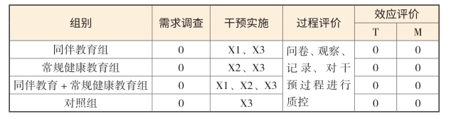 注:0——观察及收集资料,X1——同伴教育,X2——常规健康教育,X3——校园活动,T——干预活动后一周,M——干预活动后六个月。