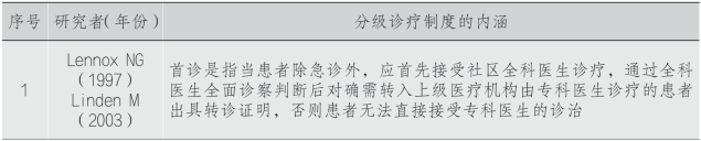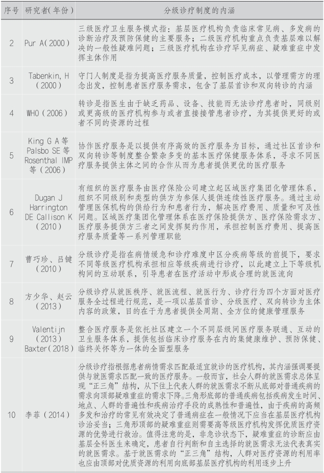 国内外学者对分级诊疗的研究历经了一个发展过程。分级诊疗制度的萌芽起始于20世纪初,美国水利电力部门建立第一个健康维护组织,引入了“守门人”的概念,但这一理念并未成为主流。到20世纪20年代,俄国经历革命战争,为解决战争后导致的饥荒和数百万人死于斑疹伤寒的疫病危机,苏联建立高度中央计划,行政管制的分级诊疗制度,对患者就医行为进行严格管理,配合计划经济时期的完全预算制管制型社会体系,强调政府责任,注重社会性疾病的预防,不仅有利于方便患者就近就医,也有利于国家更好地把控医疗资源的分配。而后随着二战的到来及结束,苏联领土扩张的地区以及被苏联解放的地区,和涌入共产主义思想的亚洲、非洲和拉丁美洲等地,都学习借鉴了苏联经验,分级诊疗制度设计也被沿袭下来。随着苏联的做法获得优良绩效,1948年英国建立国家卫生服务制度,被认为是在市场经济体制中嵌入了一个相对计划的医疗服务市场,门诊服务是一个自由执业者为主的市场,医院服务则与苏联的做法相似。由于该制度更加公平,被英联邦国家或受英国影响较多的国家学习模仿。1957年WHO将医疗服务分为初级保健、二级保健和三级保健,要求根据患者病情需要提供不同级别的医疗服务。1983年WHO基于三级医疗卫生服务概念的基础上强调以社区和家庭为依托的基本医疗卫生服务,整合医疗资源,防止因小病大治造成资源浪费。WHO于2015年提出依托基层建立整合型健康服务体系的全新全球卫生战略框架。因此,国外学者多使用如下这些相近的概念代表分级诊疗:三级卫生医疗服务(tiered healthcare delivery system)、守门人制度(gatekeeper systems)、转诊(referral system)或第一线照护(firstcontact,first point of services)、一体化诊疗服务或整合服务(integrated service/care delivery system,integrated care/service)、协作医疗服务(coordinated care)和有组织的医疗服务(organized delivery system,managed care)。目前我国在国家政策层面仅明确了分级诊疗的政策框架和建设内涵,在学术层面,国内外学者根据自身的研究对分级诊疗内涵的论述不尽一致,现将典型论述归纳如表2-1所示。