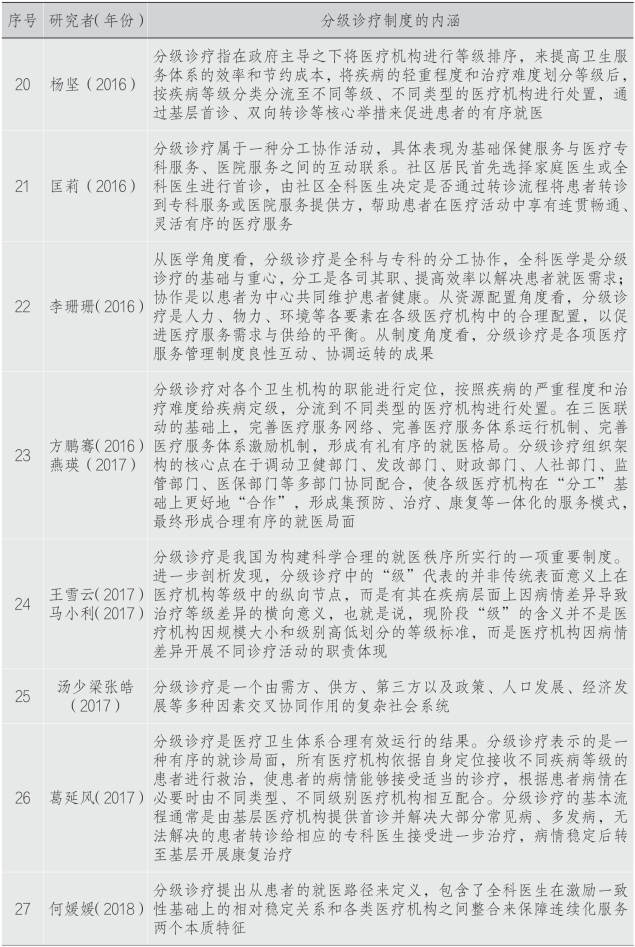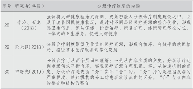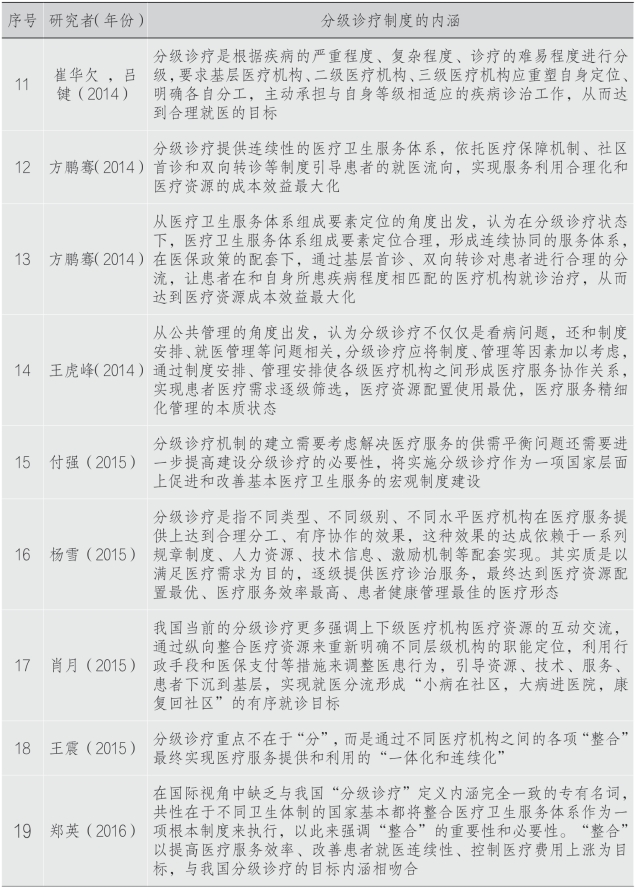 从词频来看,出现最多的词按排序从高到低分别是:连续性(11次)、基层首诊(9次)、双向转诊(9次)、整合(6次)、急慢分治(6次)、控制成本(5次)、上下联动(4次)、分工合作(4次)、效率(4次)、协同性(4次)、一体化(3次)、可及性(3次)、医疗资源配置最优(3次)、服务质量(2次)、公平(2次)、可负担性(2次)、卫生资源有效利用(2次)、激励(2次)、效益(1次)、均等化(1次)。其中,“医疗资源配置最优”“卫生资源有效利用”这两个名词常用于从政府视角等宏观层面来说明分级诊疗的内涵,本研究的立足点是提供医疗服务的医疗卫生机构,因此,这两个名词暂不纳入其中。从学者对分级诊疗内涵研究的演变可知:分级诊疗的内涵不断丰富,从协作服务逐渐走向整合服务的理念。国家战略从最早的以保护工业劳动力为主,到改革开放时期的以疾病治疗为中心,缓解“看病难”和“看病贵”问题,到现在国家提出的健康中国战略,分级诊疗的内涵将定位于国民健康,原先的以疾病治疗为中心的内涵已不利于全民健康覆盖和健康中国战略目标的实现,因此,必须将分级诊制度建设与健康理念深度融合,通过整合各层次的医疗卫生资源构建一体化健康服务,实现全民健康。因此,分级诊疗的内涵可以概括为:通过医疗卫生服务整合过程,使卫生资源得到有效利用和最优配置,从而达到提升医疗服务质量、效率和效益,控制医疗成本,减轻患者医疗负担的目的,实现基层首诊、双向转诊、急慢分治、上下联动,为患者提供连续的、可及的、围绕全生命周期的一体化服务,进一步提升国民健康水平。