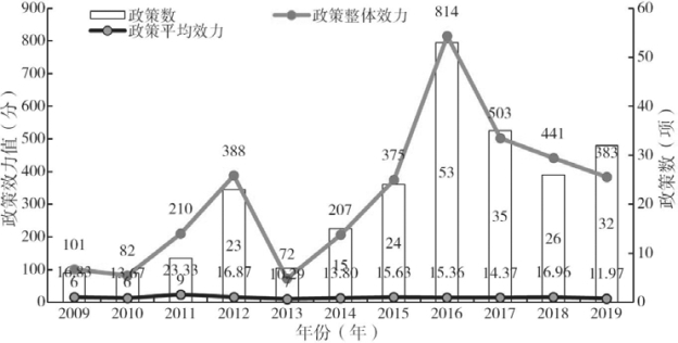 图6-1 2009—2019年我国分级诊疗政策文件数量、政策效力和年平均效力情况