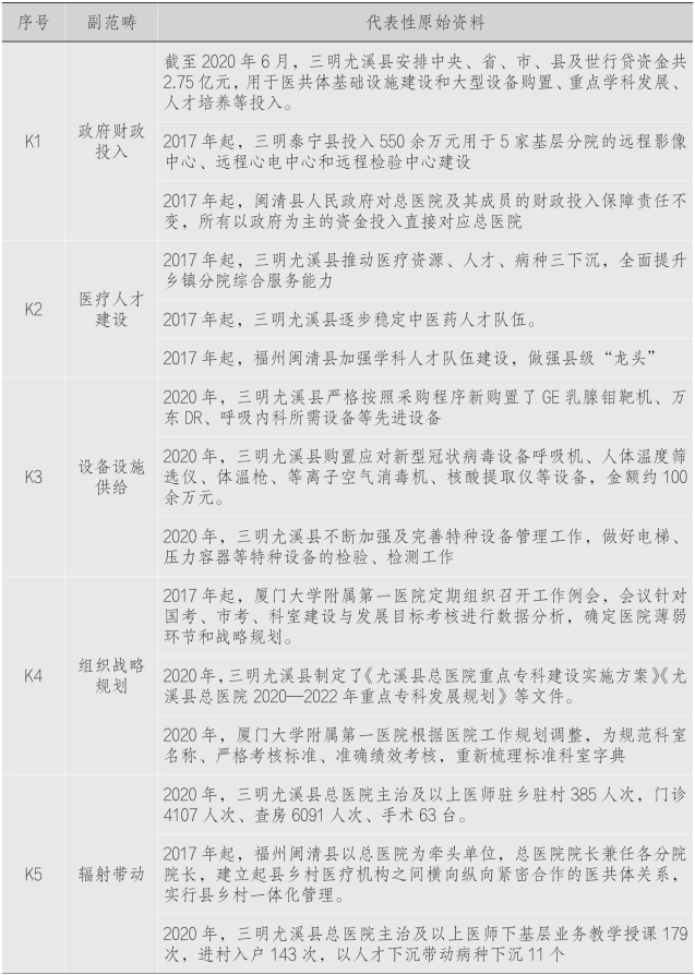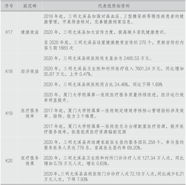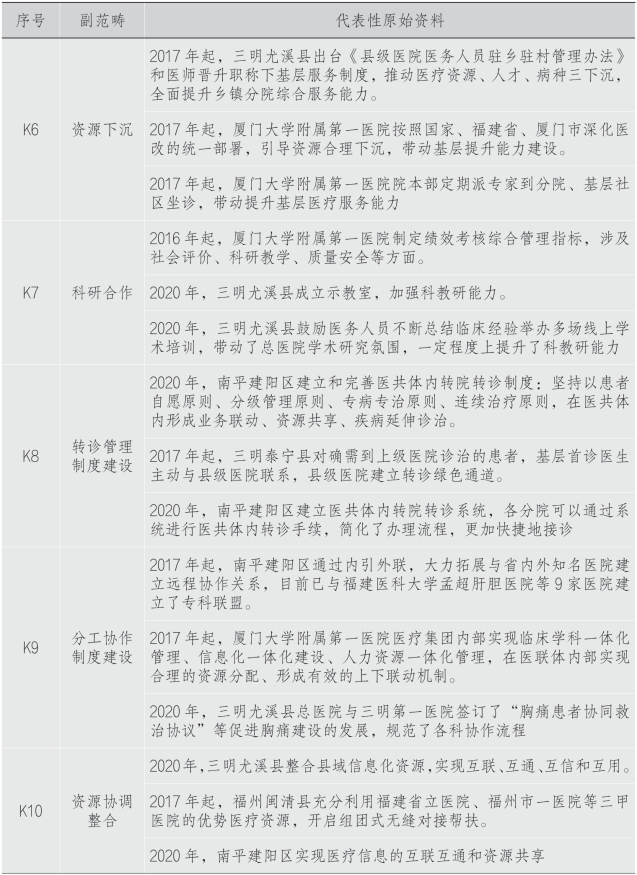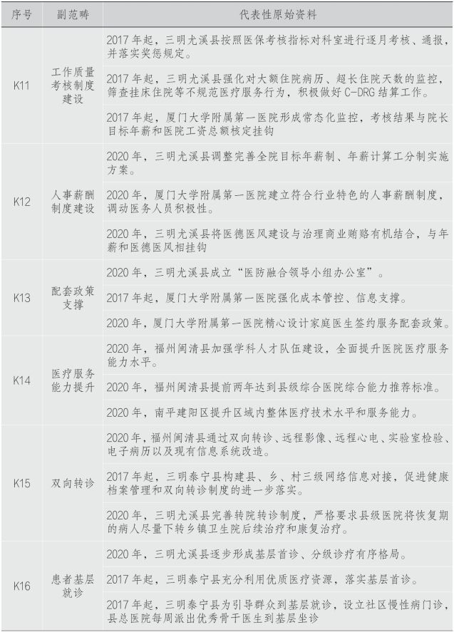 开放译码是扎根理论的第一级译码。在这一级译码中,所有原始资料均被拆散,并进行开放性记录,而后通过语句表达形成初始概念。根据“概念与范畴”对分级诊疗运行机制发展过程进行归纳总结,使用数据译码和归类表格等方式对资料进行总结,形成对上文关于分级诊疗运行机制的准确描述。译码过程由3位译码员共同完成,在正式译码工作开始之前,从所有资料中随机抽取20份作为前测样本,由3位译码员按照译码说明依次进行译码,将前测译码结果依据Holsti的内容分析法相互同意度及信度公式进行计算。