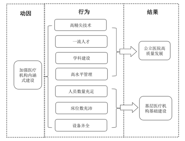 从“动因—行为—结果”这一普适逻辑,对医疗机构服务能力建设机制的演化特点与机理展开分析。公立医院高质量发展是我国经济发展到一定程度后的转型升级,公立医院的发展应以更宽广的视野来定位,紧跟医学发展前沿,提高聚集医疗辐射能力。向上学习国内外顶尖医院,与高水平科研院所搭建学术交流,引进高水平医疗人才,加快学科建设,提升医疗技术水平,攻破疑难疾病;向下与医联体医院合作,加强医联体建设,下沉优质医疗资源,提升基层医疗机构常见病救治能力,推进分级诊疗运行。充分发挥人才、科技的保障作用,推动医院改革创新。人才是医院发展的核心竞争力,利用精准引才、高端研修、专项培养等引培并举的人才战略,提升临床医学学科的整体实力,实现医院跨越式发展。医疗科技创新是医院综合实力的重要体现,医疗服务质量则影响着民众就医体验。医院还必须提升管理能力,管理水平的高低则影响着医院整体运行效率和医疗质量安全。基层医疗机构需要有数量足够的医务工作者,提供基本医疗、公共卫生和妇幼保健等服务,承担高血压、糖尿病、心脑血管疾病和呼吸系统疾病等常见病、多发病的一般诊疗,对诊断明确、病情稳定的慢性病患者提供康复、护理、随访及转诊服务,同时配备有与一般诊疗相对应的医疗设备,并拥有足够的床位数服务于下转的患者。基于过程分析,本研究从上级医院和基层医疗机构两个视角将医疗机构服务能力建设的相关机制总结如图7-2所示。