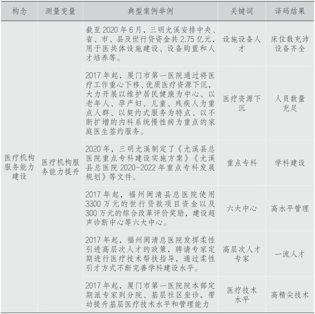 表7-4 医疗机构服务能力建设机制典型案例举例及译码结果