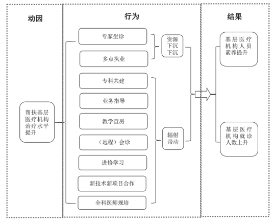 从“动因—行为—结果”这一普适逻辑,对互动交流机制的演化特点与机理展开分析。互动交流主要表现为医疗资源下沉和辐射带动两部分,其本质强调组织内部之间的架构特点与合作过程。分级诊疗顺利进行,不仅需要上下级医疗机构在分工明确之下各自发展,还需要建立合作关系,通过专家坐诊、多点执业、专科共建、业务指导、教学查房、远程会诊、进修学习、新技术新项目合作和全科医师规范化培训等方式,提升基层医疗机构医疗服务能力,促进基层首诊,提升群众就医的便利性、就医体验以及满意度。基于过程分析,本研究将互动交流机制的相关机制总结如图7-3所示。