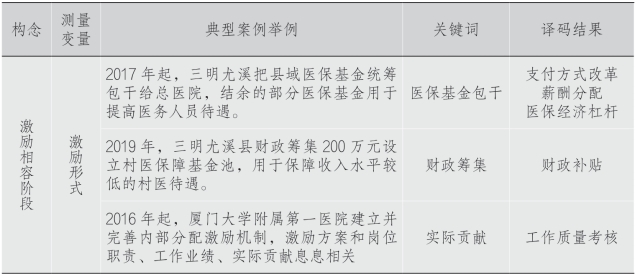 激励相容机制典型案例举例和译码结果如表7-7所示,译码结果分成3种不同主体的激励机制建设。第一个是公立医院的激励,主要通过财政补贴、薪酬分配、支付方式改革和工作质量考核来实现;第二个是基层医疗机构的激励,主要通过薪酬分配和工作质量考核来实现;第三个是患者的激励,主要通过医保经济杠杆的方式来实现。这种模式在三明市尤溪县和厦门大学附属第一医院整合型医疗服务机构的激励相容中均有体现。