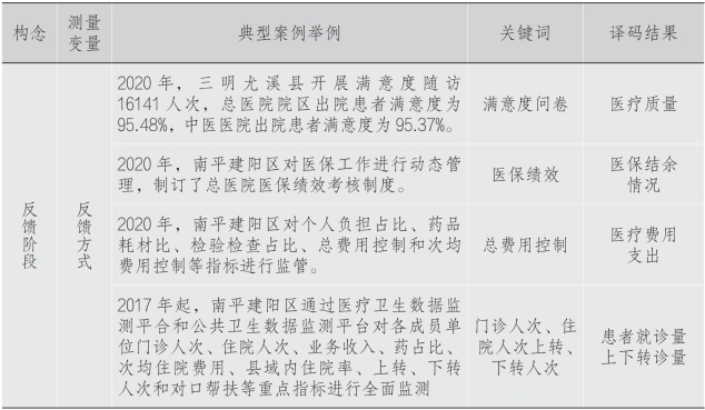反馈机制典型案例举例和译码结果如表7-9所示,通过分级诊疗相关数据的反馈,根据分级诊疗的要求和特点,确定具体的数据指标包括健康档案数、资金缺口、人才数量、医保结余情况、医疗质量、患者就诊量、医疗费用支出和上下转诊量等,并实时反馈数据,发现存在问题,剖析原因并提出解决方案。这种模式在三明市尤溪县和南平市建阳区整合型医疗服务机构的互动交流中均有体现。