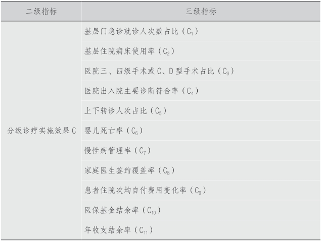 分级诊疗实施效果是分级诊疗实施的转化和反馈环节,按照第七章研究的结果,分级诊疗实施的转化和反馈内容包含分级诊疗的直接效果和长期效益,涉及分诊效果、健康效益和医疗成本控制等三个方面,下面从这三个方面确定评价指标。