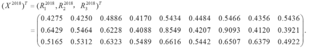 一级指标的评价是在二级指标评价的基础上进行的,根据上述所得的2018年的三个二级指标的综合评价结果重新构造矩阵(X2018)T。
