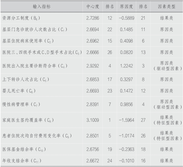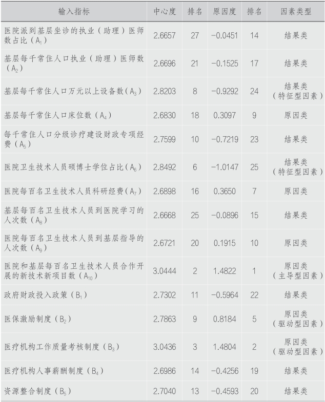 中心度为(Di+Ri),原因度为(Di-Ri)。中心度代表评价指标的重要程度,中心度越大,该指标对分级诊疗制度绩效的影响程度越大;原因度代表评价指标间的相互关联关系,原因度大于零,其影响度大,是原因型因素;原因度小于零,其受到其他指标影响度大,是结果型因素。将中心度大于所有中心度均值的原因类因素分为主导型因素(原因度为最大)、驱动型因素,将中心度大于所有中心度均值的结果类因素称为特征型因素。