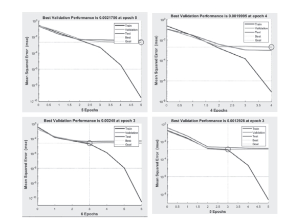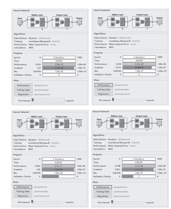 采取重复构建BP网络100次,选取其中4次结果进行展示,训练结果如图9-3所示。