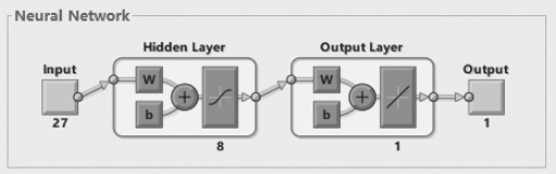 神经元输入矩阵为:X=(xij)27×69,选取隐含层神经元个数为8个,输出层矩阵为Y=(yij)1×69。如图9-2所示。