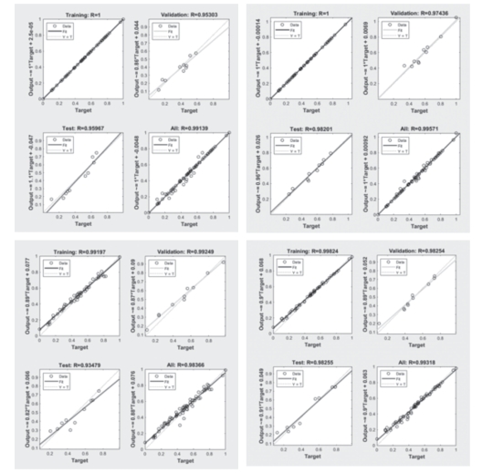 深入分析训练过程,4次实验结果的误差变化曲线如图9-4所示,BP神经网络模型训练的回归曲线如图9-5所示。其反映的是模型训练集、检验集、测试集的均方误差随着迭代次数增加的变化情况。