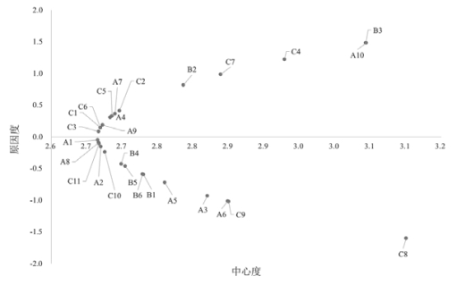 根据上述步骤,计算出分级诊疗制度各绩效评价指标的中心度和原因度,见表9-6和图9-6。