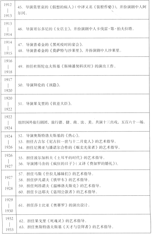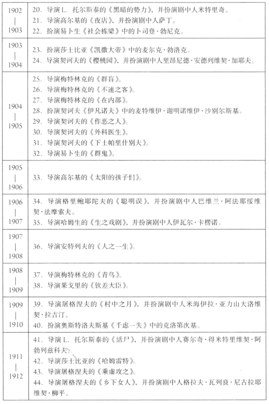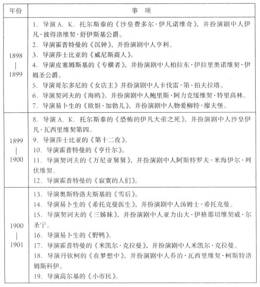 斯坦尼斯拉夫斯基在莫斯科艺术剧场的演剧工作年表