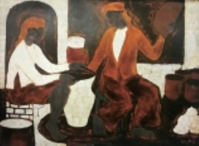 博大精深的中国传统漆艺在明朝时期传入越南。到了现代,大约20世纪中期,一部分越南画家在法国艺术的影响下,逐渐摸索出一套特有的漆画表现形式,让人耳目一新,给中国的艺术家们以新的启示。在越南著名漆画家金同作品《砂锅作坊里》中,运用蛋壳粉和金粉表现了劳动青年的形象,手法大胆,形象简约、舒朗,意蕴深厚。用标准的人体结构比例来衡量,人物造型显然不准确。殊不知这正是艺术家的高明之处,不拘泥人物解剖结构和形象比例,不受具体形的桎梏,从艺术本质和主体精神出发形成的高品格的意象艺术创造。(见图2)