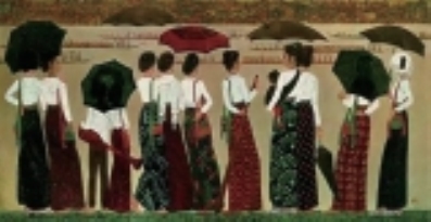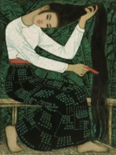 1978年,乔十光先生的漆画作品《梳妆傣女》(图2)创作完成,画面中的傣女侧坐在椅子上,歪头梳着自己的秀发,表情平静而恬淡。乔十光先生在创作时有意拉长了她的脖子与秀发,后移了右脚,使整个人的动作平展开,从而更适应画面空间,这些肢体与动作的处理构成了画面的装饰性。整个画面虽有一定的空间关系,但背景依旧是大面积的装饰性元素,长裙上的装饰则由一定规律的点、线构成。同年的作品《泼水节》(图3)塑造了12位平行排布的傣族少女,她们的身材、发型、服装都明显相似,且在较多数人物画面中,如果过于追求人物面部细节的表现,难免会削减画面的装饰性,因此在这幅作品中表现了大量的背影,使观者不必纠结于人物的面部表情与细节。将远处的龙舟处理为接近点和线的图形,作为背景的河水,运用了单一颜色,给画面保留了大量的留白空间,这些去繁从简的处理使画面更趋向平面化。比较《梳妆傣女》和《泼水节》这两幅作品的特点,可以看出乔十光先生有意将画面中通常用来表现空间感的部分削弱,使整个画面尽量脱离透视的影响,且舍弃了光影效果的表现,这样的表现手法是这两幅画作为乔十光先生创作历程中具有代表性的装饰性人物漆画的重要依据。