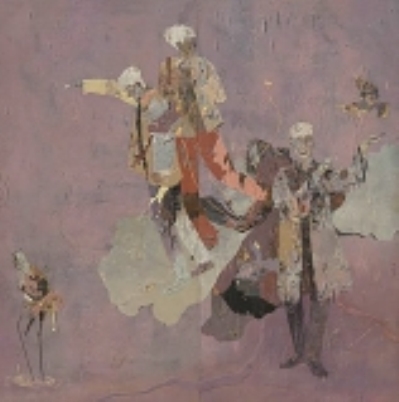 而第十三届全国美展中,余潮松的作品《春天里的仪式感》又展现了另一种极富有个人风格的人物漆画作品,由于他在岩彩和漆画上均有涉猎,因此作品中有许多托生于岩彩的特殊技法,无论在技法表现上还是画面构成上都有一定的独立性,突破了自漆画在中国发展以来传统漆艺的影响。画板的塑造是作品的第一步,也是一个作品整体氛围的基石,传统漆艺影响下的漆画大多在纯黑的平滑漆板上进行各种肌理与技法的堆积,而余潮松的画板并不追求平整,而是刻意保留画板制作过程中的工艺痕迹,例如以裱布环节中错落不平的布纹或刮灰后坑洼的灰层次作为整体画面的肌理基础,不再磨平后用黑漆填补平整,之后直接进行色漆的罩染。在人物的表现上,他偏向用人物丰富的肢体语言突破画面中人物形象的普遍性与逻辑性,如《春天里的仪式感》中画面中间的两个人物站在云端之上,服装和人物肌肤的边界被刻意模糊,塑造出一种亦真亦幻的氛围,以这样夸张的表现方法扩大观者对于画面所表现情感的想象空间。无论是某种艺术派别或是绘画手法、应用的材料,实际上都是创作者个人对于当前时代精神的理解的外在展现,作品从二维空间的描绘转向思想空间的塑造,表现了当代年轻人对于现实与虚妄的思考与疑问,从而凸显作品对于人文精神的表达。