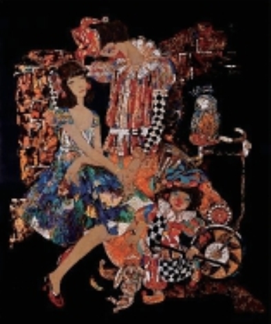 在2014年第十二届全国美展中,陈娜的《若只如初见》是漆画获奖作品中很有个人色彩的一幅。女性形象在漆画人物题材中一直是多数,但之前的许多作品如《梳妆的傣女》《渔舟飘至》等,都是站在男性的角度表现女性,画面的感情与思想都处于欣赏美的角度,虽然有很强的美感与一定的故事性,但对于女性情感的表现有所欠缺。陈娜作为“90后”女性画家,笔下的人物在情绪的表现上更有细腻之感。《若只如初见》作品中表现了少女与小丑之间暗流的情感,虽然靠近但并不接触,其中少女稍歪头做思考状,而小丑的脸上夸张的装扮与低垂的头让人难以看出他的情绪,结合作品的题目让观者对二人的关系与情绪产生多种猜疑。这幅作品以表现当代年轻人间的情感为主题,画面刻意将背景处理为黑色,并不为两人的相处设定一定的场景,使作品的创作脱离某种故事前提与社会背景,黑色的背景与两人身边色彩与纹样极为丰富的小丑元素产生对比,少女深蓝色的长裙与周围代表小丑的红色服装亦形成呼应,给观者留下了相当大的想象空间。