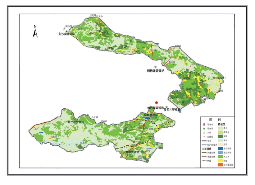 灌丛作为保护区的主要植被类型,在保护区东北部分布着许多小叶锦鸡儿(Caragana microphylla)灌丛和柠条锦鸡儿(Caragana korshinskii)灌丛,在保护区西南部分布着大面积乌柳(Salix cheilophila)灌丛。人工沙柳(Salix psamophila)灌丛、小叶锦鸡儿灌丛、柠条锦鸡儿灌和杨柴(Hedysarum fruticosum var. mongolicum)灌丛等,广泛分布于保护区内部。保护区内的灌丛与草本植物混生,形成多种类型的灌草丛植被(图1-3)。