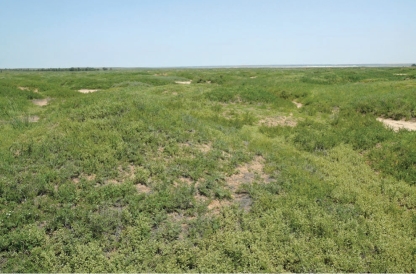 盐生草甸植被主要分布于保护区南部和东北部,有白刺(Nitraria tangutorum)群落(图1-6)、芨芨草(Achnatherum splendens)群落、盐爪爪(Kalidium foliatum)群落、尖叶盐爪爪(Kalidium cuspidatum)群落、细枝盐爪爪(Kalidium gracile)群落和碱蓬(Suaeda spp.)群落等。