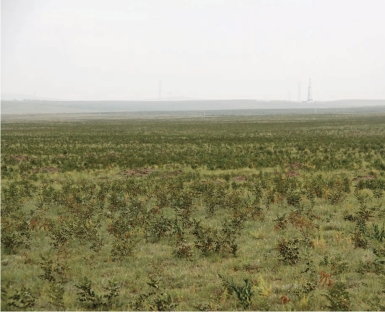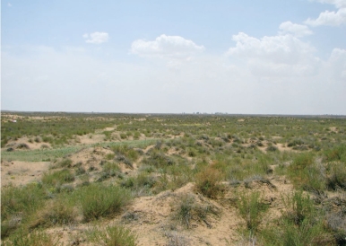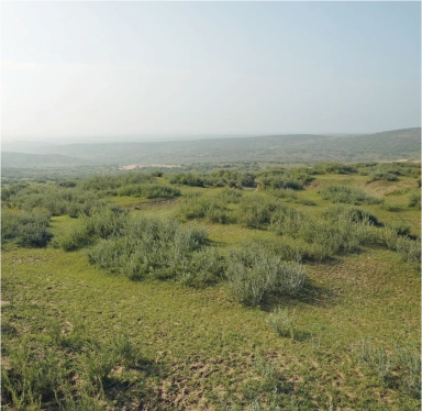 荒漠植被主要以黑沙蒿(Artemisia ordosica)群落(图1-5)、白沙蒿(Artemisia sphaerocephala)群落、红砂(Reaumuria soongorica)群落、猫头刺(Oxytropis aciphylla)群落和毛刺锦鸡儿(Caragana tibetica)群落为主,其中黑沙蒿群落在保护区广泛分布,白沙蒿群落分布于保护区北半部的东北部,红砂和猫头刺群落主要分布于保护区南半部的中西部,毛刺锦鸡儿群落主要分布于保护区南半部的中部石质丘陵区。