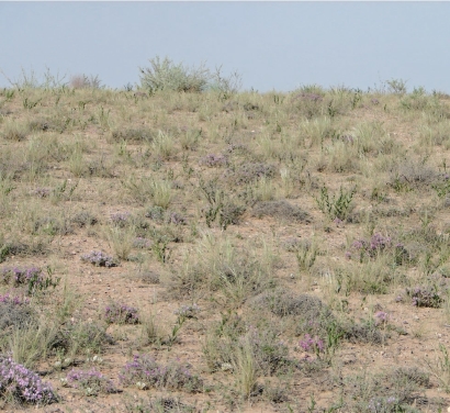 草原主要分布于保护区南半部的中西部,有沙生针茅(Stipa glareosa)、短花针茅(Stipa breviflora)群落、沙芦草(Agropyron mongolicum)群落、糙隐子草(Cleistogenes squarrosa)群落和戈壁针茅(Stipa tianschanica var. gobica)群落等。荒漠草原以针茅(Stipa spp.)群落为主,分布于硬梁地带砾石梁顶(图1-4)。