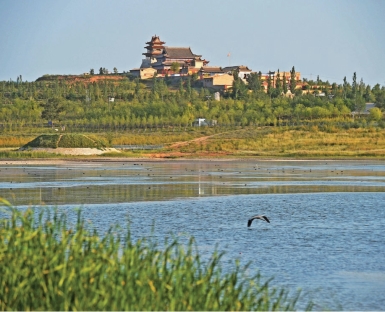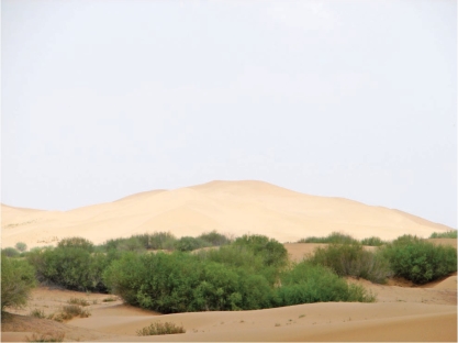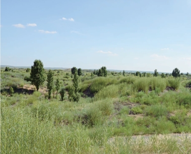 由于受土地沙化影响,保护区分布有较大面积的黑沙蒿、苦豆子(Sophora alopecuroides)、甘草、沙芦草、白草(Pennisetum flaccidam)等沙生植物组成的植物群落。同时,通过人工造林和封育管理,已形成一定规模的人工乔木林(榆树林、杨树林、樟子松林、旱柳林和沙枣林等)和人工灌木林(小叶锦鸡儿林、柠条锦鸡儿林、沙柳林和柽柳林等)。由于植被类型丰富、镶嵌分布,保护区在不同季节呈现多样化的植被景观特征,或高低错落有致,或黄绿相依出彩,总能使人感受到生态之美(图1-18)。