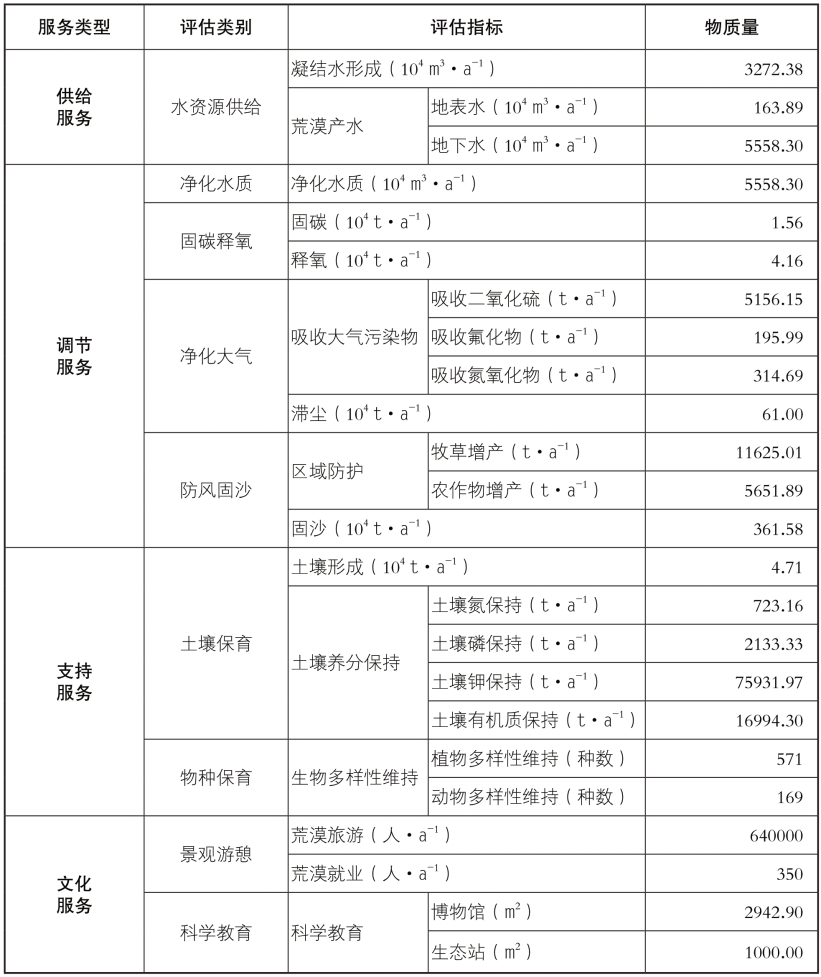 表3-5 保护区荒漠生态系统服务功能物质量评估结果