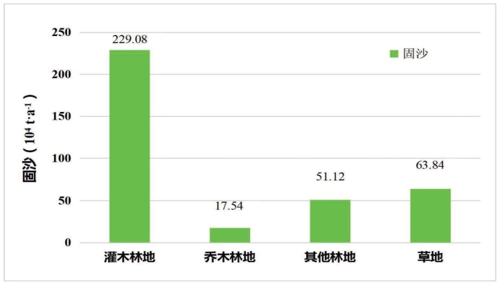 荒漠生态系统防风固沙服务功能,包括区域防护和固沙2 项评估内容,但是区域防护服务功能无法进行地类归属,因而仅对固沙服务功能进行地类统计分析。保护区灌木林地年固沙量为229.08×104t,分别为乔木林地、其他林地和草地年固沙量的13.1倍、4.5倍和3.6倍(表3-7;图3-15)。