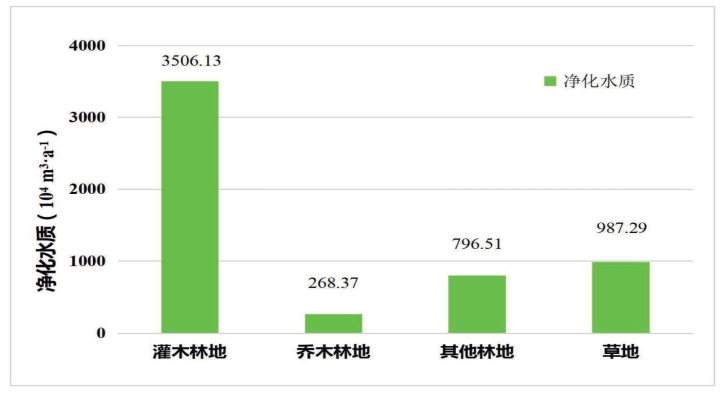 由于灌木林地和草地的蒸散量要小于乔木林地,所以在实际情况中,单位面积灌木林地、草地和其他林地的净化水质数量要高于乔木林地。