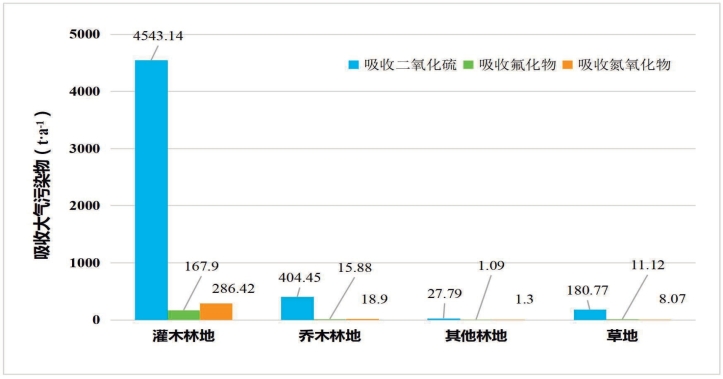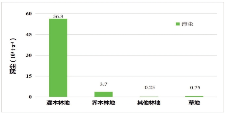 目前,大气污染物的清除主要依靠植物吸收或吸附。对于具有相当规模的能源生产和油气化工企业的盐池县而言,县域内良好的植被对于净化大气、改善环境治理至关重要。保护区灌木林吸收大气污染物、吸附大气粉尘的数量均为乔木林地的10~15 倍,其他林地(疏林地)的林木也具有一定的净化大气的服务功能(表3-7;图3-13、3-14)。