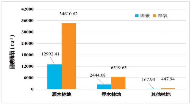 单位面积乔木林的固碳释氧能力,通常高于灌木林。但是由于受到水资源的约束,半干旱区乔木林的固碳释氧能力并不能完全得以发挥。尽管半干旱区的乔木林比灌木林具有略高的固碳释氧功能,但这是建立在对水资源更多消耗的前提之下实现的。保护区灌木林地固碳量和释氧量最大,约为乔木林地的5.3 倍。此外,其他林地(疏林地)也具备一定的固碳释氧功能(表3-7;图3-12)。
