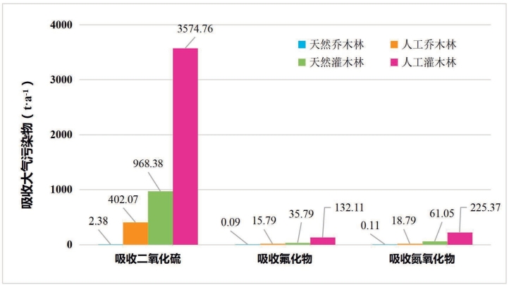 哈巴湖保护区荒漠生态系统吸收大气污染物,主要由人工灌木林和天然灌木林贡献,其中人工乔木林的贡献量排第三,天然乔木林的贡献量微乎其微(表3-8;图3-19)。