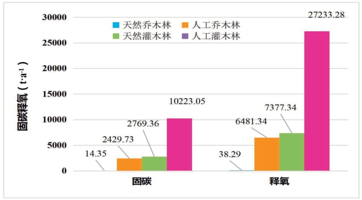 图3-18 不同起源灌木林和乔木林固碳释氧服务功能物质量