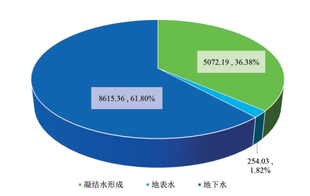 哈巴湖保护区荒漠生态系统每年的水资源供给服务功能价值为13941.58 万元,占保护区荒漠生态系统服务功能总价值的4.38%(表4-1)。其中,凝结水形成服务功能的年价值量为5072.19 万元(占供给服务价值量的36.38%),荒漠产水(地表水、地下水)服务功能年价值量为8869.39 万元(占供给服务价值量的63.62%)(图4-2)。