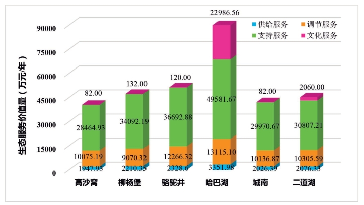 哈巴湖保护区高沙窝管理站、柳杨堡管理站、骆驼井管理站和城南管理站的荒漠生态系统服务价值量组成结构较为一致,均以支持服务价值为主、调节服务和供给服务价值为辅,兼有少量文化服务价值。哈巴湖管理站和二道湖管理站荒漠生态系统,由于能够提供相对较多的文化服务,其文化服务价值量明显高于其他管理站,而支持服务、调节服务和供给服务价值量的组成结构与其他管理站基本一致。