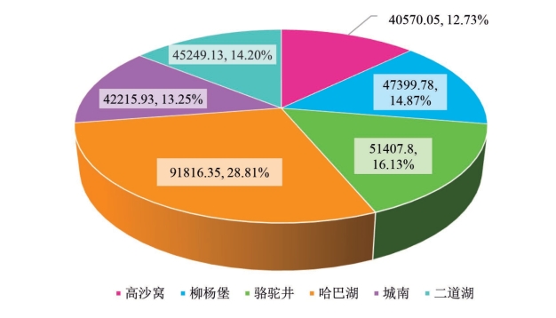 哈巴湖保护区6 个管理站中,以哈巴湖管理站系统服务功能价值量最大,占保护区生态服务功能总价值的28.81%;以高沙窝管理站荒漠生态系统服务功能价值量最小,占保护区总价值的12.73%。各管理站生态系统服务功能价值量大小排序为:哈巴湖管理站>骆驼井管理站>柳杨堡管理站>二道湖管理站>城南管理站 > 高沙窝管理站(表4-2;图4-6)。