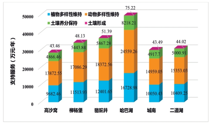 评估结果显示,保护区各管理站荒漠生态系统支持服务功能价值量大小排序为:哈巴湖管理站(49581.67 万元/年)>骆驼井管理站(36692.88 万元/年)>柳杨堡管理站(34092.19万元/年)>二道湖管理站(30807.21 万元/年)>城南管理站(29970.67 万元/年)>高沙窝管理站(28464.93 万元/年)(表4-2;图4-10)。