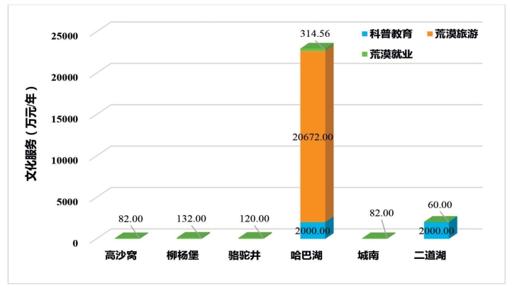 保护区荒漠生态系统文化服务价值以荒漠旅游为主体。哈巴湖管理站作为保护区开展荒漠旅游、科普教育的主要场所,其荒漠生态系统文化服务价值占到保护区荒漠生态系统文化服务价值的90.28%。
